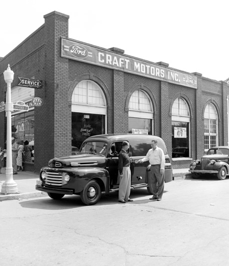 Exterior view of Craft Motors Incorporated, located at 202-220 East Sullivan Street. The business sold Ford, Lincoln-Zephyr, and Mercury automobiles, and provided automobile repair services.
