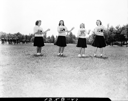 Dobyns-Bennett High School cheerleaders practicing. The football team is visible in the background.