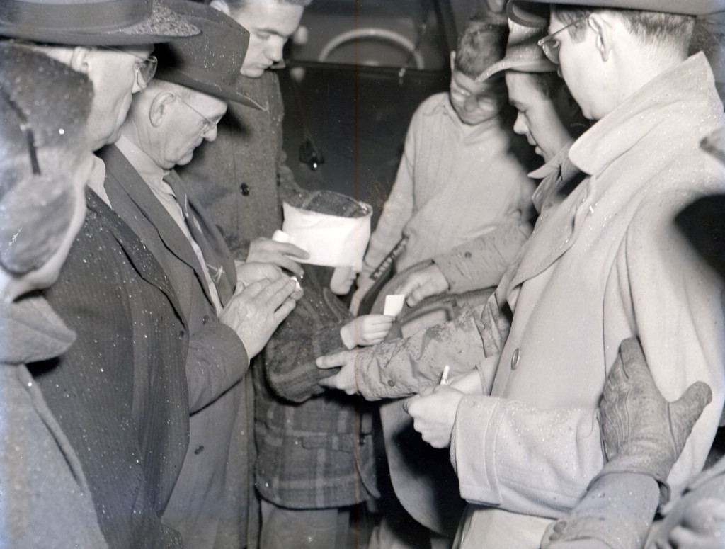 A large crowd gathers for a drawing to win a new 1947 Studebaker.