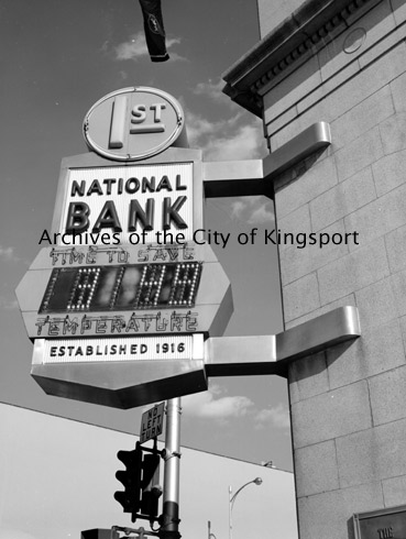 The First National Bank time and temperature sign on the corner of Center and Broad Street.