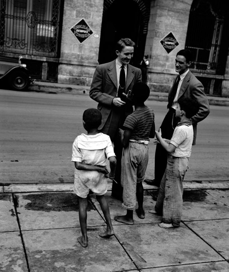 George Peters and unidentified man talking to Cuban children in Havana, Cuba.