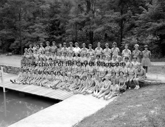 Group photo of girl scouts at the Appalachian Girl Scout Council Camp, Camp Sky-Wa-Mo. Camp Sky-Wa-Mo, opened in 1947, is located in Bluff City.
