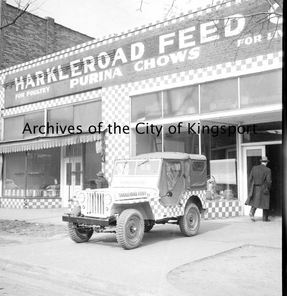 Exterior of the Harkleroad Feed Company. Harkleroad Feed Company was located at 124 E. Market and was owned by Mrs. Margaret D. and Robert H. Harkleroad. The store sold feeds, seeds, insecticides, farm machinery, fertilizers, bee and poultry supplies, garden tools, and freezers.