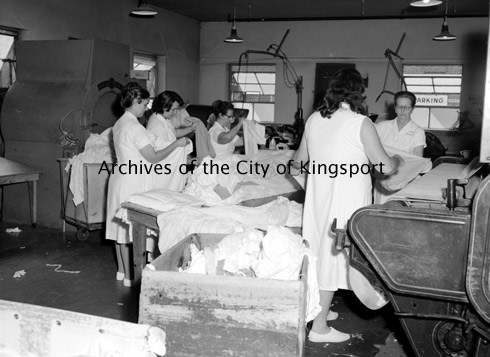 Women working in the laundry facilities at Holston Valley Community Hospital.
