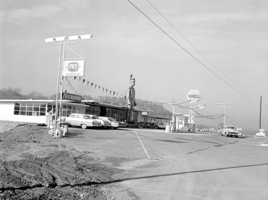 Honest John’s was located on East Stone Drive and was owned by John D. Barker. Honest John’s operated as a restaurant, gas station, and souvenir/novelty shop. The “Big Indian” carved by Honest John himself was 32 feet tall and although Honest John’s closed years ago the statue still stands today.