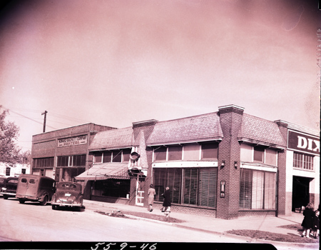 Exterior view of the corner of Dixie Maid Baking Company, located at 201 Cherokee Street, and Howard Duckett Company, located at 206 East Charlemont Avenue. Dixie Maid Company sold retail and wholesale baked goods. The business was owned by Lee R. Drury and Denzil S. Sample. Howard Duckett Company provided publishing, printing, and lithography services and sold labels and office and factory forms. The company manager was Howard T. Watson; Mrs. Jo H. Fuller was the company president and treasurer.