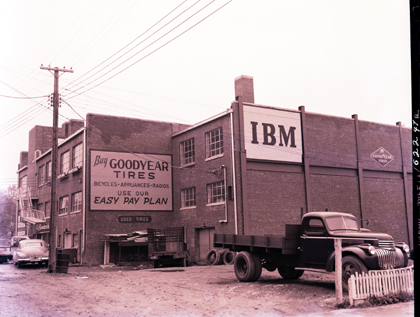 This photograph shows the exterior of the IBM building, along with a billboard.