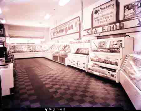 Interior of the Little Store Super Market with a view of the vegetable isle. The Little Store was located at 313-315 West Sullivan Street.