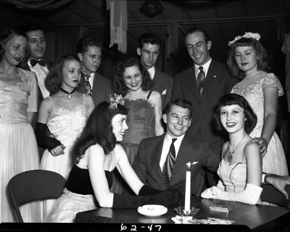 Group photo of Irene Crawford (sitting, right) and guests at her farewell party at the Civic Auditorium. This photograph was taken for the Kingsport Times News. Miss Crawford, a 1946 graduate of Dobyns-Bennett High School, was leaving for New York City to attend the Barbizon School of Modeling.