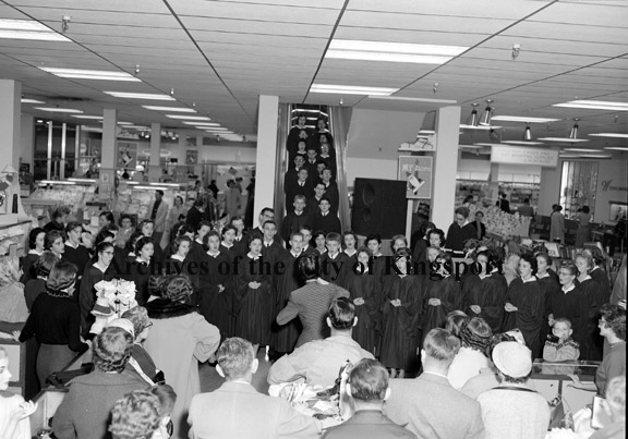 A choir performing inside the J. Fred Johnson & Company.