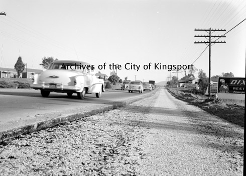 A view down Johnson City Highway. To the let of the picture is the Broadway Tourist Court and to the right is Peerless Steak House.
