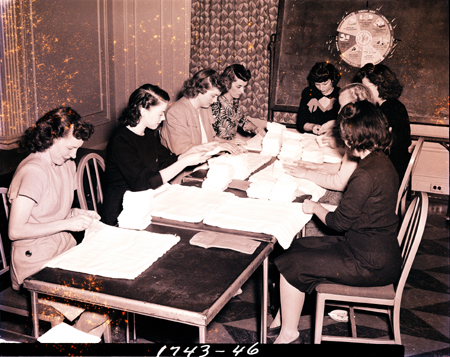 Eight ladies of the Junior Welfare League sitting at tables folding cloth.