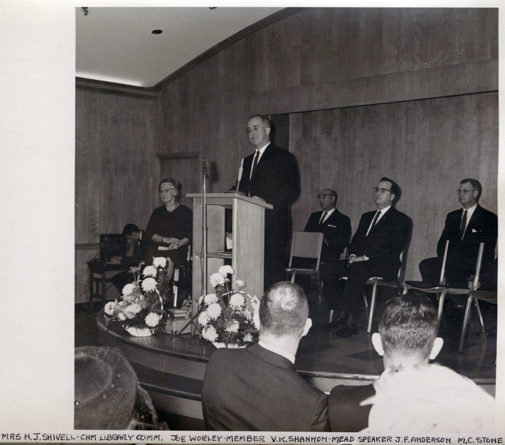 Mrs. J.H. Shivell, Joe Worley, V.K. Shannon, J.F. Anderson, and M.C. Stone. The picture is from a scrapbook of the dedication of the J. Fred Johnson Library and George H. Mead Auditorium.