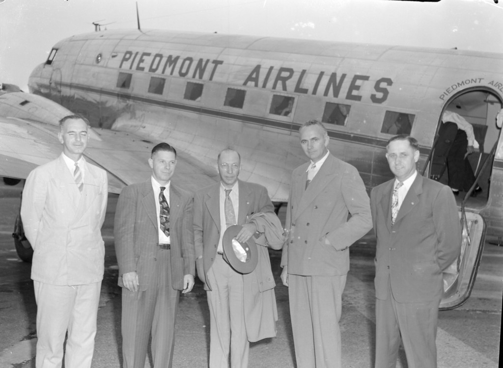 Members of the Kingsport Kiwanis club in front of a Piedmont Airlines plane.