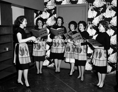 The “Singing Housewives” rehearsing for the Kiwanis Kapers performance. From left to right: Sylvia Thompson, Katharine Shivar, Nancy Peterson, Frances Walters, Ellen Crowther and Jean Kern.
