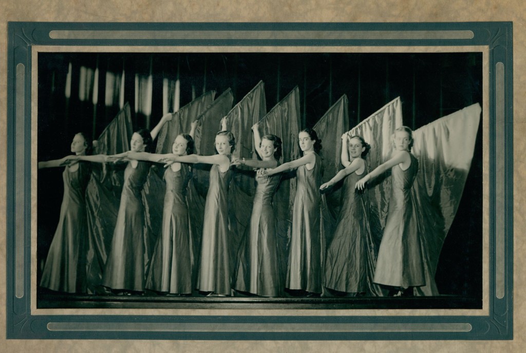 An image taken of performers from the Kiwanis Kapers. The Kiwanis Kapers were a community variety program. The Kapers had a number of acts that varied from a chorus line, to a minstrel act, and various variety skits.