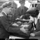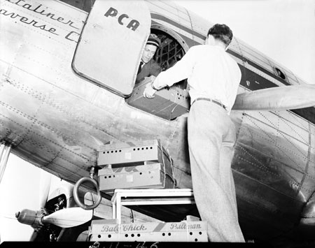 Men loading boxes of chicks onto an airplane at Tri-Cities Airport, then called Tri-City airport. This was a delivery for Air Express.