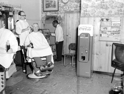 Macanack Barber Shop was located at 504 E. Center Street. The shop was owned by Mac Jones and Axley “Ack” Burdine. Pictured is barber Mac Jones. The customer and shoeshine man are unidentified.The picture was commissioned by the Coca-Cola Company.