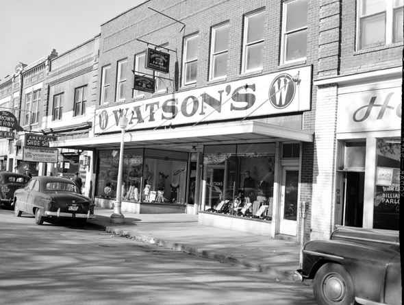 Shops on Main Street in this image include Watson’s, American Shoe Shop, the Brown Derby, and the Double Eagle Billiard Parlor. On the second floor above Watson’s was the Independent Order of Odd Fellows Hall that was a meeting place for the Lovedale Lodge of the Independent Order of Odd Fellows as well as other fraternal organizations.