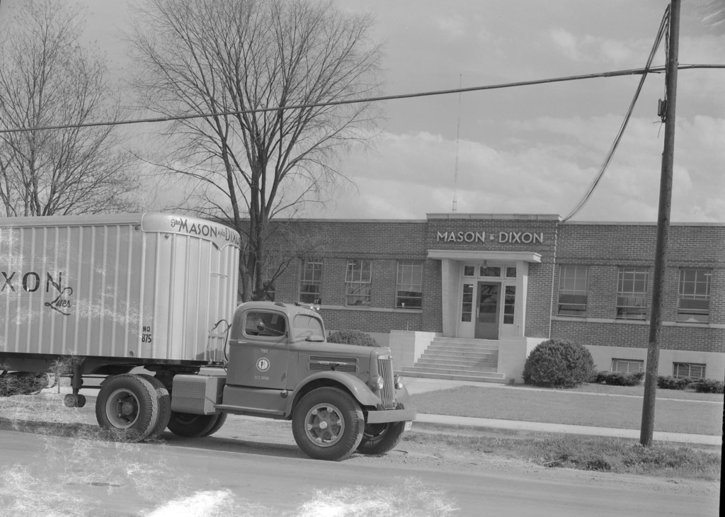 Mason & Dixon company truck parked in front of the Mason & Dixon building. The trucking company was located on Eastman Road. E. Ward King was president and treasurer of the company; Stewart T. King was the vice president; Lloyd W. Pendleton was the secretary; D. Ruth Pickering was the assistant secretary.