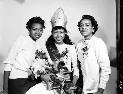 Miss Douglass High School, Marie Briscoe, and her court. The two attendants are Ruby Hodges (left) and Gwendolyn Burnette (right).