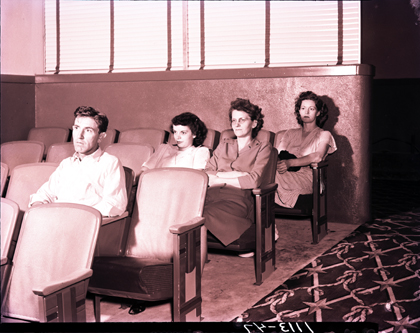 Three women and one man sitting it seats in the Strand Theatre. The Strand was located at 140 Broad Street.