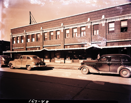 Side view of the Nall Building located at 104 East Market Street. The building housed a number of small establishments including Central Barber Shop (at 102 E. Market), Western Union (100 E. Market), Jona’s Accessory Shop, the Hutchins Dentist Office, and real estate offices.