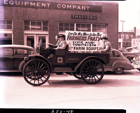 Three men in a truck advertising the Farmer’s Party at the Civic Auditorium. The photo was taken in downtown Kingsport.