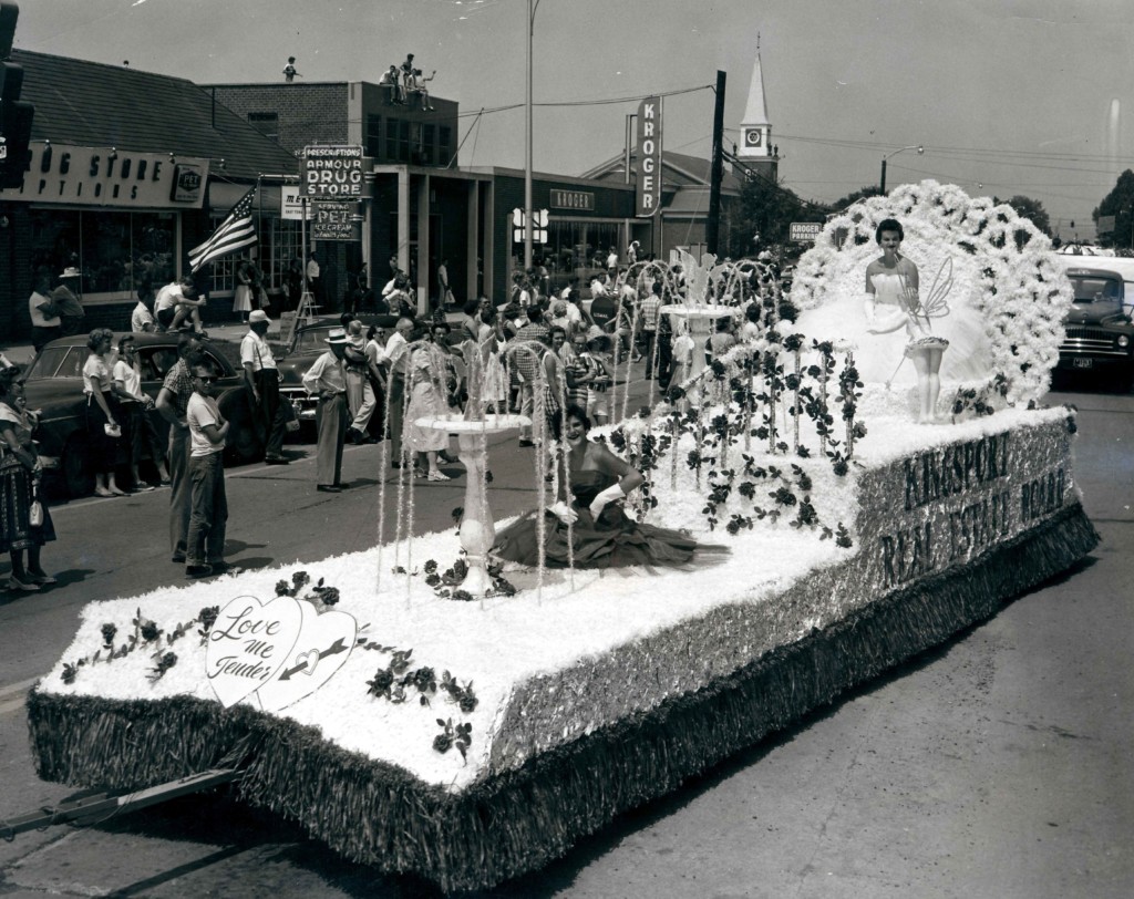 Fourth of July parade float sponsored by the Kingsport Real Estate Board. In the background is Armour Drug Store and Kroger.