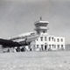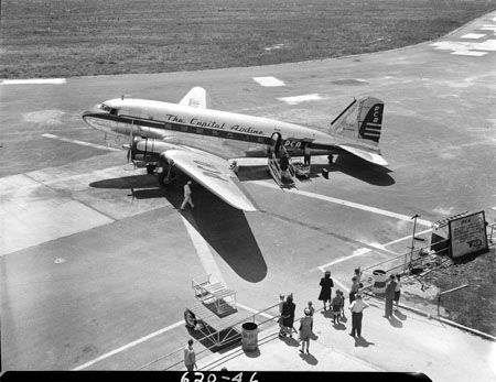 A PCA airplane at Tri-City Airport. On the plane is written “PCA” and “The Capital Airline.” On the plane’s right wing the numbers 1787 are visible. On the right side of the photo is a sign that reads, “Fly PCA, New York, Knoxville, Detroit, Pittsburgh, New Orleans, Chicago, Cleveland, Buffalo, Birmingham.”