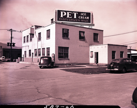 Exterior view of Pet Dairy Products Company, located on the corner of West Market and Clay streets. Spurgeon G. Roach was the manager; Albert T. Lowe was the assistant manager. The company sold milk, cream, cottage cheese, buttermilk, butter, and other dairy products.