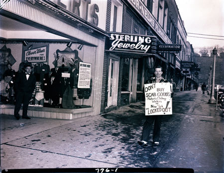 Union picketing at Roberts Wearing Apparel. Roberts was located at 133 Broad Street. The placard reads “Don’t Buy Scab Goods Roberts Clothing Workers in New York are LOCKED OUT!”