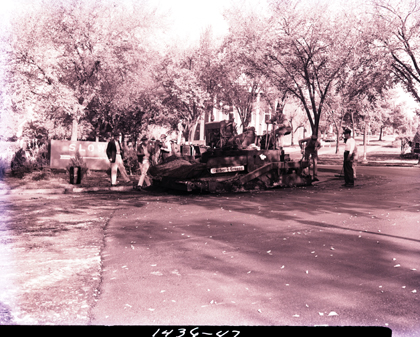 Crew of men doing roadwork at Church Circle. The machinery has “Barber-Greene” written on it.