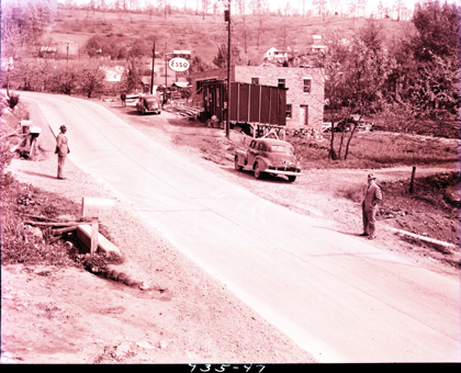 Two men standing beside a rural road. On the right are a building still under construction and a business with a sign that reads, “Standard Esso Dealer.” The photograph was taken for Bennett & Edwards Incorporated.