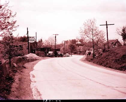 View of an unknown rural road. On the left is a business with a sign that reads, “Standard Esso Dealer.” The photograph was taken for Bennett & Edwards Incorporated.