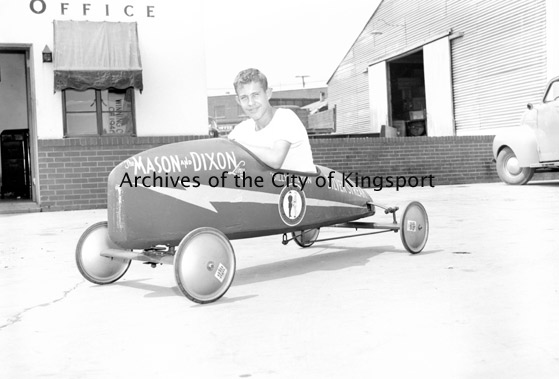 Unidentified boy in a soap box derby car sponsored by Mason & Dixon.