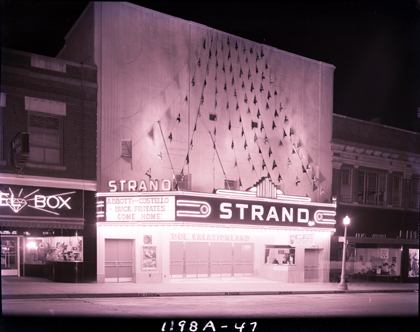This image shows a night view of the Strand Theatre located at 140 Broad Street. When this image was taken, moviegoers could come and enjoy Buck Privates Come Home staring Abbott and Costello.