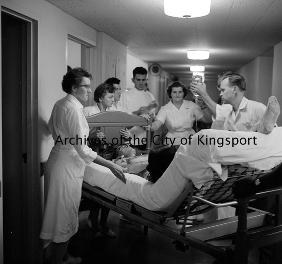 A scene from Holston Valley Community Hospital following an explosion at the Aniline division of Tennessee Eastman on October 4th, 1960. Fifteen people were killed as a result of the explosion and 200 more were injured.