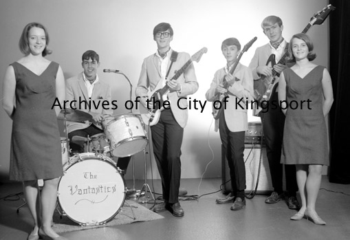 Photo of the musical group the Vantastics. The Vantastics were a local band that played around Kingsport from 1963-1965. From left to right: Mary Swann, Ned Berndt, Bobbie Honaker, Mike Milhorn, Steve Murr and Carol Ann Hurd.