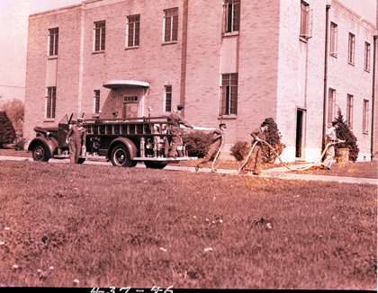 Firefighters from the Kingsport Fire Department, Station No. 2, performing a training exercise. The department is located at 1804 Crescent Drive, between Fort Henry Drive (then named Johnson City Highway) and Center Street(then Bristol Highway). Jas C. Taylor was the chief.