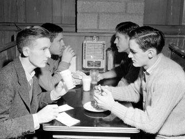 Unidentified group of basketball players eating in a cafe in St. Augustine.