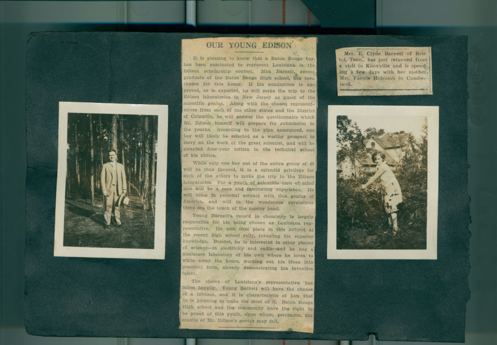 The scrapbook details the early years of her marriage to Clyde Barnett and her involvement in various social groups such as the Woodlawn Garden Club and the Palette and Brush Club later in life. The scrapbook contain newspaper clippings, photographs, correspondence, and event programs.