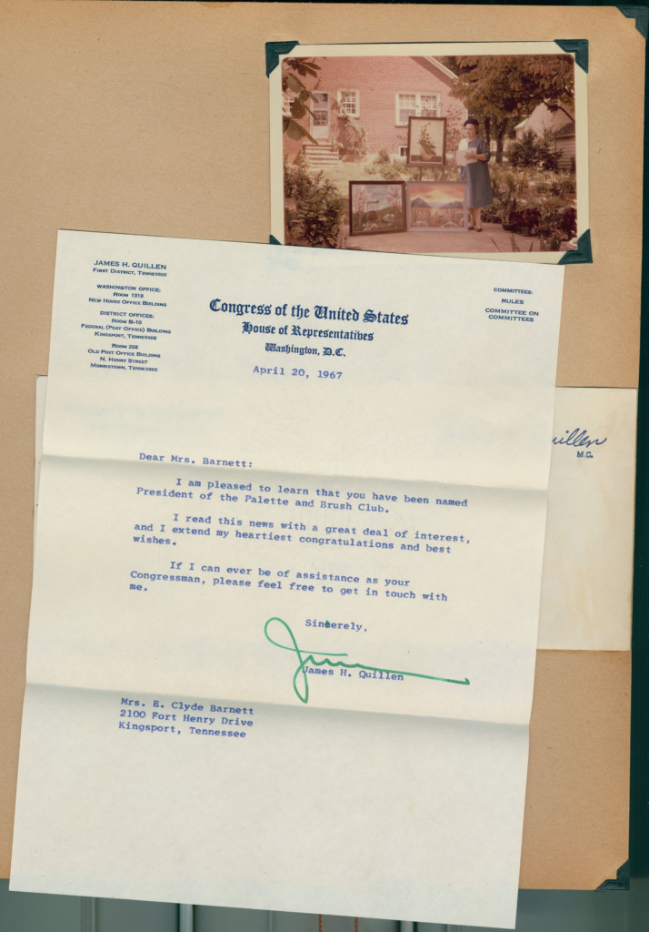 The scrapbook details the early years of her marriage to Clyde Barnett and her involvement in various social groups such as the Woodlawn Garden Club and the Palette and Brush Club later in life. The scrapbook contain newspaper clippings, photographs, correspondence, and event programs.