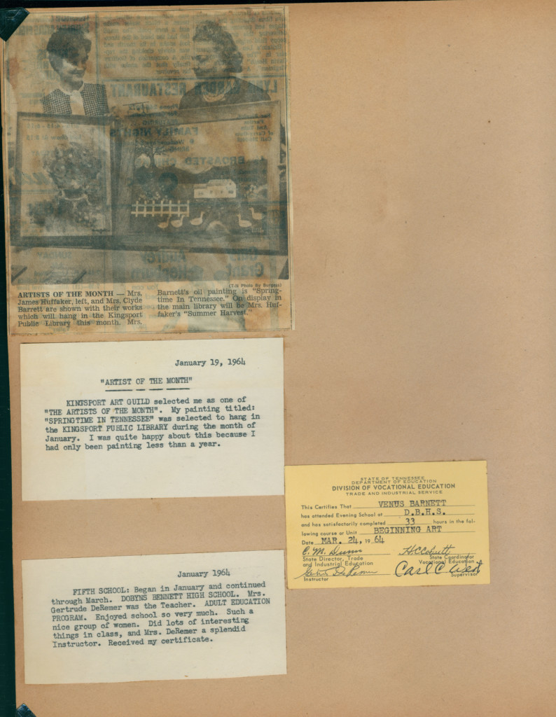 The scrapbook details the early years of her marriage to Clyde Barnett and her involvement in various social groups such as the Woodlawn Garden Club and the Palette and Brush Club later in life. The scrapbook contain newspaper clippings, photographs, correspondence, and event programs.
