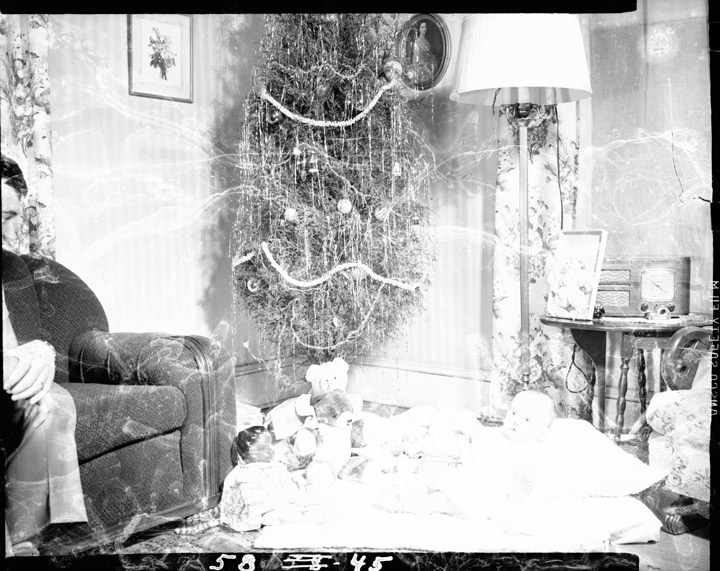 William Y. Harkins sitting in his living room, Christmas time.